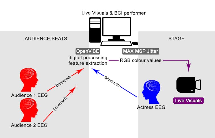 For the first time, the technology enabled one performer and two members of the audience to interact simultaneously. Using their passive brain-activity – separately or jointly – they were able to control aspects of the live projected film. Their transition from relaxed to more alert cognitive states was visualised as a shift from colder to warmer tints. This created the constantly changing colour of the live projections and set the overall atmosphere of the narrative.
