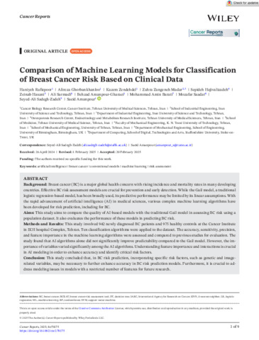 Haniyeh, Rafiepoor, Alireza, Ghorbankhanloo, Kazem, Zendehdel, Zahra, Zangeneh Madar, Sepideh, Hajivalizadeh, Zeinab, Hasani, Ali, Sarmadi, Behzad, Amanpour-Gharaei, Mohammad Amin, Barati, Mozafar, Saadat, Seyed-Ali, Sadegh-Zadeh and Saeid, Amanpour (2025) Comparison of Machine Learning Models for Classificationof Breast Cancer Risk Based on Clinical Data. Cancer Reports, 8 (4). e70175. ISSN 2573-8348