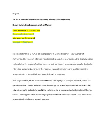 Mallon, Sharon, Borgstrom, Erica and Murphy, Sam (2025) The Art of ‘Sensitive’ Supervision: Supporting, Sharing and Strengthening. In: Handbook of Sensitive Research in the Social Sciences. 978 1 03531 522 2 . Edward Elgar, London, pp. 55-63.