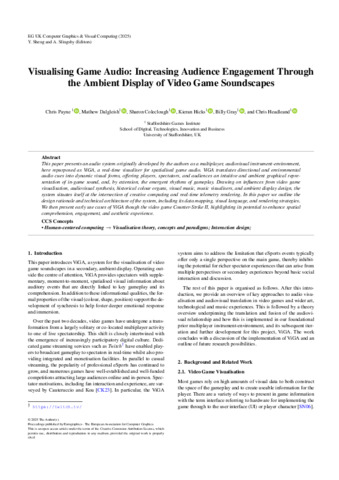 Payne, Chris, DALGLEISH, Mathew, COLECLOUGH, Sharon, HICKS, Kieran, Gray, Bill and HEADLEAND, Christopher (2025) Visualising Game Audio: Increasing Audience Engagement Through the Ambient Display of Video Game Soundscapes. In: Computer Graphics & Visual Computing (CGVC) 2025: Eurographics UK Chapter Proceedings. The Eurographics Association. ISBN 978-3-03868-293-6