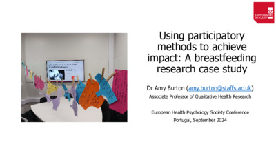 Burton, Amy (2024) Using participatory methods to achieve impact: A breastfeeding research case study. In: 38th Annual Conference of the European Health Psychology Society, 3-6th September 2024, Portugal.