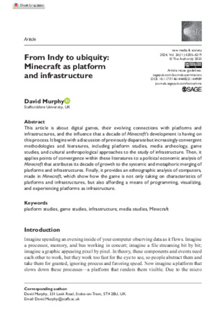 Murphy, David (2024) From Indy to ubiquity: Minecraft as platform and infrastructure. New Media & Society, 26 (11). ISSN 1461-7315