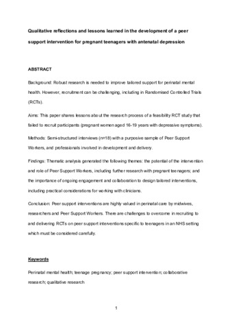 | Uncontrolled Keywords: | Perinatal mental health; teenage pregnancy; peer support intervention; collaborative research; qualitative research |