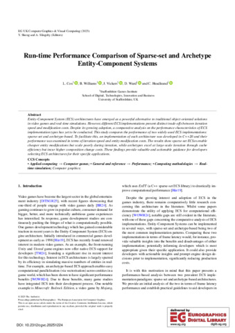 Cox, Louis, WILLIAMS, Benjamin, VICKERS, James, WARD, Davin and HEADLEAND, Christopher (2025) Run-time Performance Comparison of Sparse-set and Archetype Entity-Component Systems. In: Computer Graphics & Visual Computing (CGVC) 2025: Eurographics UK Chapter Proceedings. The Eurographics Association, Liverpool John Moores University, UK. ISBN 978-3-03868-293-6