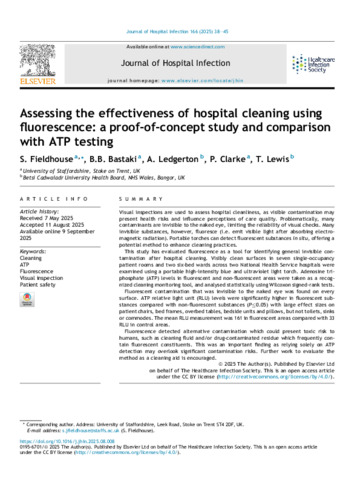 FIELDHOUSE, Sarah, Bastaki, Benhur Bakhtiari, Ledgerton, Andrea, Clarke, Paul and Lewis, Trystan (2025) Assessing Hospital Cleaning Effectiveness Using Fluorescence: A Proof-of-Concept Study and Comparison to ATP Testing. Journal of Hospital Infection. ISSN 0195-6701