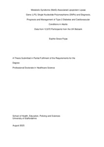 Fojas, Esphie Grace (2025) Metabolic Syndrome (MetS)-Associated Lipoprotein Lipase Gene (LPL) Single Nucleotide Polymorphisms (SNPs) and Diagnosis, Prognosis and Management of Type 2 Diabetes and Cardiovascular Conditions in Adults: Data from 12,872 Participants from the UK Biobank. Doctoral thesis, University of Staffordshire.