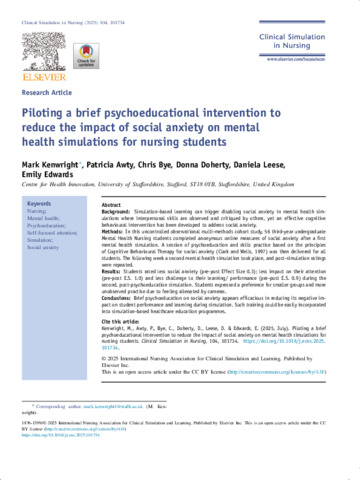 KENWRIGHT, Mark, Doherty, Donna, Bye, Christopher, Leese, Daniela and Edwards, Emily (2025) Piloting a brief psychoeducational intervention to reduce the impact of social anxiety on mental health simulations for nursing students. Clinical Simulation in Nursing, 104 (101734). ISSN 1876-1402