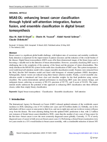 El-Shazli, Alaa M. Adel, Youssef, Sherin M., SOLIMAN, Abdel-Hamid and Chibelushi, Claude (2025) MSAE-DL: enhancing breast cancer classification through hybrid self-attention integration, feature fusion, and ensemble classification in digital breast tomosynthesis. Neural Computing and Applications, 37 (20). pp. 15635-15659. ISSN 0941-0643