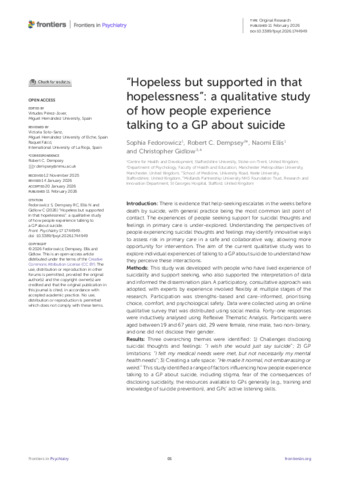 FEDOROWICZ, Sophia, DEMPSEY, Robert, ELLIS, Naomi and GIDLOW, Christopher (2026) “Hopeless but supported in that hopelessness”: A qualitative study of how people experience talking to a GP about suicide. Frontiers in Psychiatry. ISSN 1664-0640