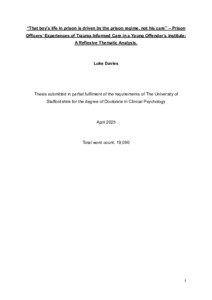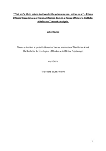 Davies, Luke (2025) “That boy's life in prison is driven by the prison regime, not his care” – Prison Officers’ Experiences of Trauma Informed Care in a Young Offender’s Institute: A Reflexive Thematic Analysis. Doctoral thesis, University of Staffordshire.