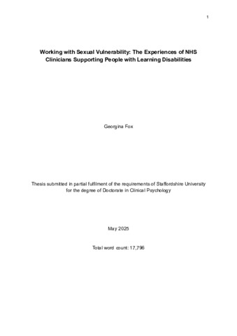 Fox, Georgina (2025) Working with Sexual Vulnerability: The Experiences of NHS Clinicians Supporting People with Learning Disabilities. Doctoral thesis, University of Staffordshire.