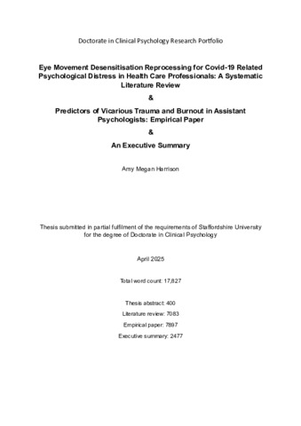 Harrison, Amy Megan (2025) Doctorate in Clinical Psychology Research Portfolio - Eye Movement Desensitisation Reprocessing for Covid-19 Related Psychological Distress in Health Care Professionals: A Systematic Literature Review & Predictors of Vicarious Trauma and Burnout in Assistant Psychologists: Empirical Paper & An Executive Summary. Doctoral thesis, University of Staffordshire.